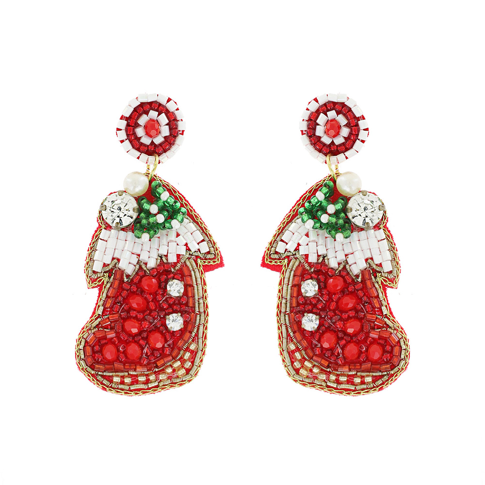 CHRISTMAS STOCKING SEED BEAD HANDMADE MULTI BEAD JEWELED EMBROIDERY DANGLE AND DROP EARRINGS