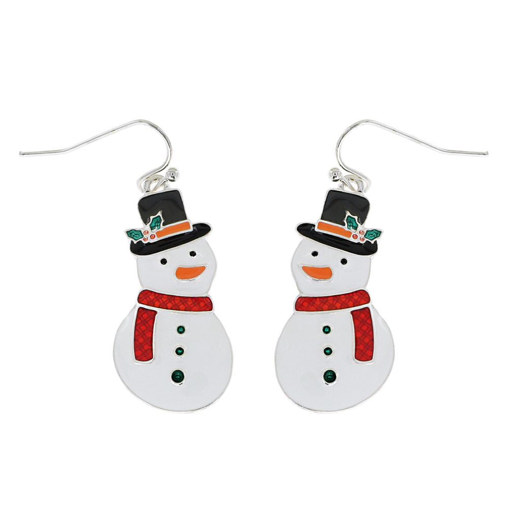 SNOWMAN -CHRISTMAS ENAMEL COATED DANGLE AND DROP FISH HOOK EARRINGS IN SILVER TONE METAL
