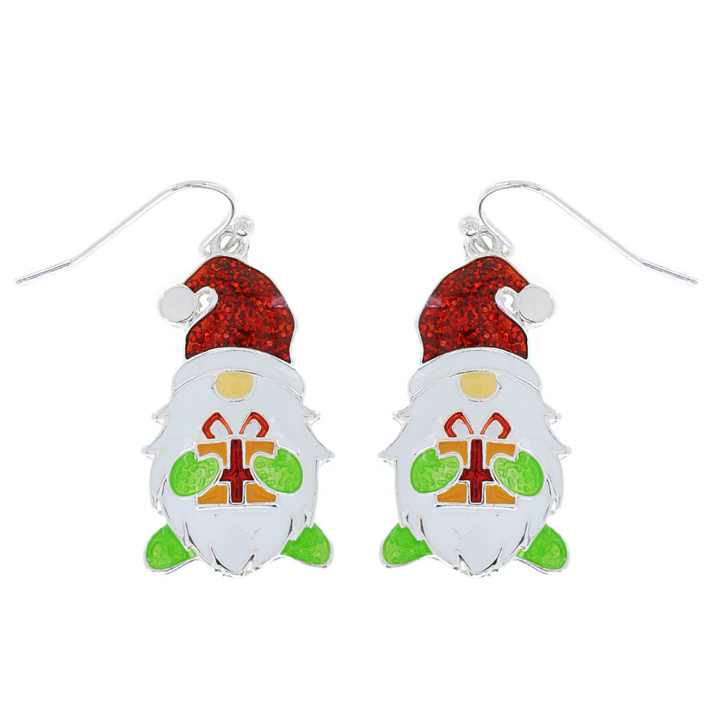 GNOME - CHRISTMAS CRYSTAL RHINESTONE ENAMEL COATED DANGLE AND DROP FISH HOOK EARRINGS IN SILVER TONE METAL
