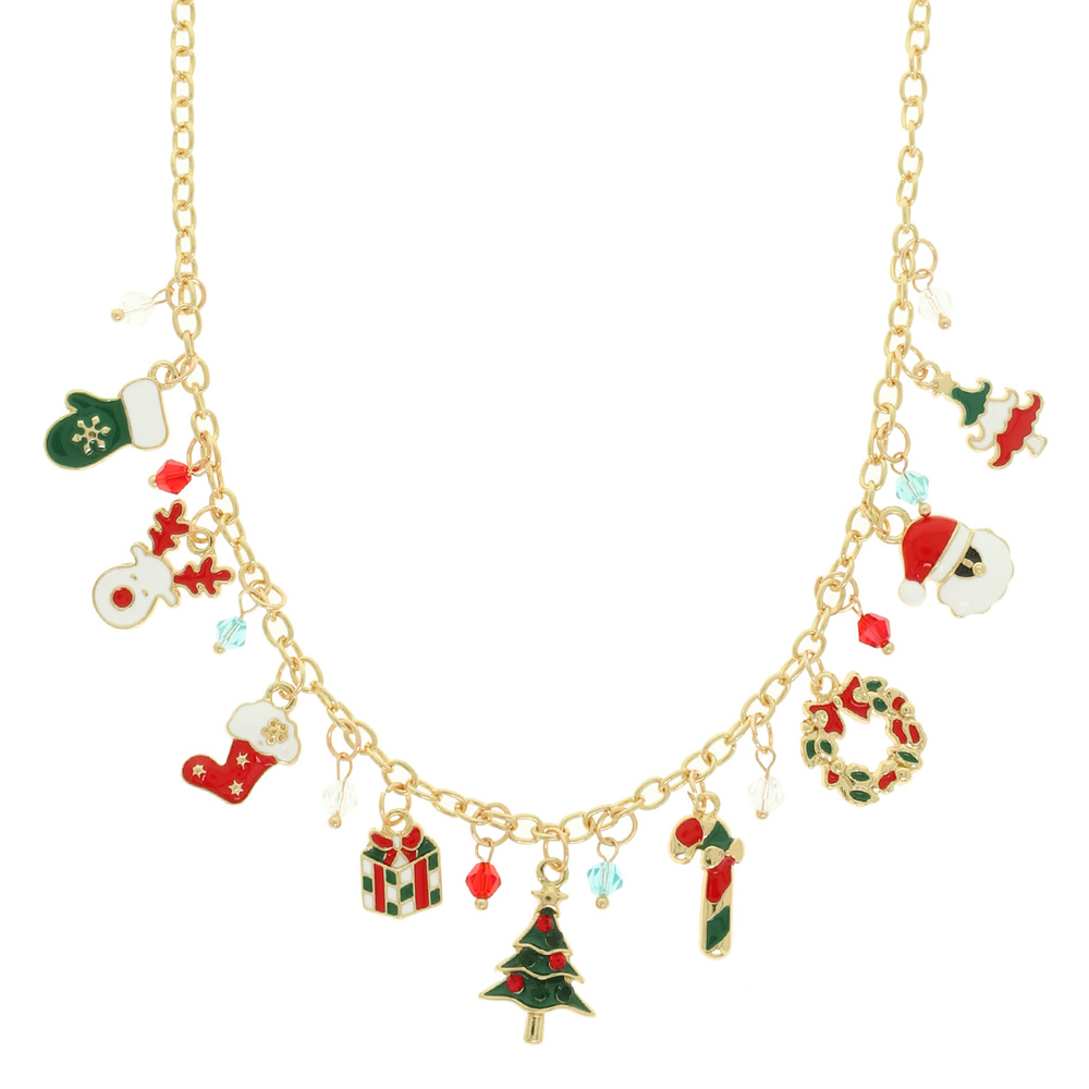 CHRISTMAS MULTI CHARM NECKLACE WITH SANTA TREE WREATH PRESENT AND MITTEN TRINKETS