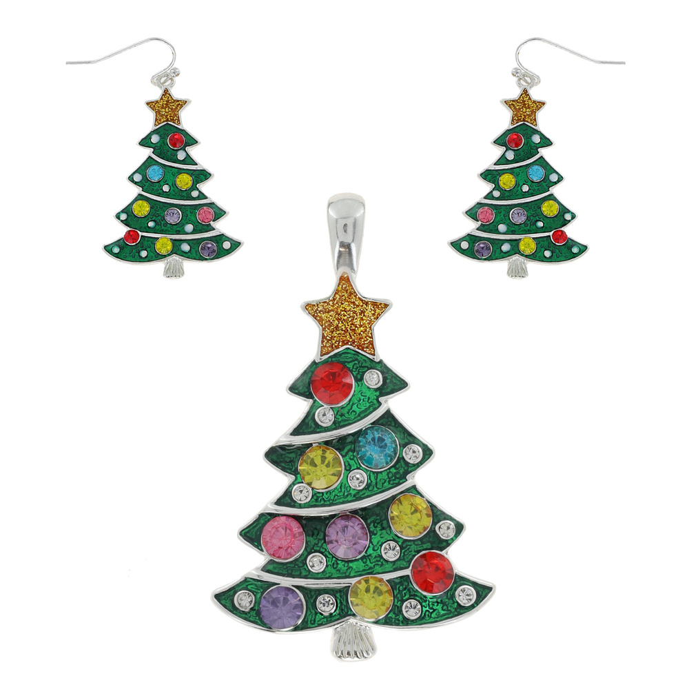 3-piece Enamel Coated Jeweled Christmas Tree Necklace Earring Set