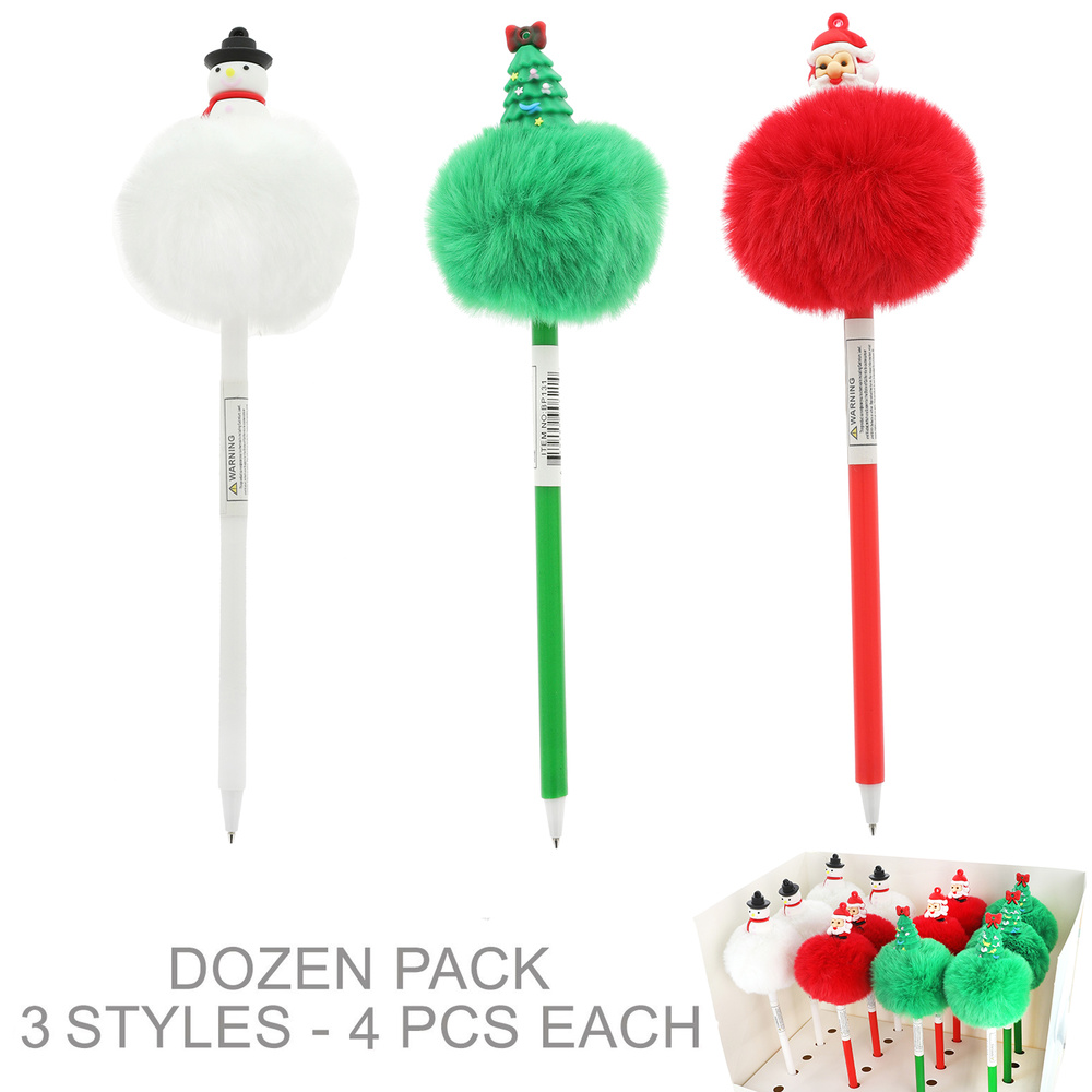 ASSORTED DOZEN PACK 3 STYLES 4-PIECE EACH CHRISTMAS THEMED POM POM BALL PENS