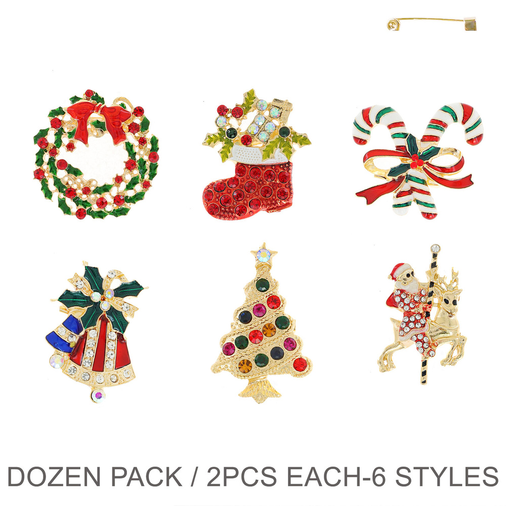 12 Pack - 6 Styles 2pcs Each - Wreath/stocking/ Candy Cane/ Bell/ Tree/ Santa - Christmas Themed Enamel Brooch Pins