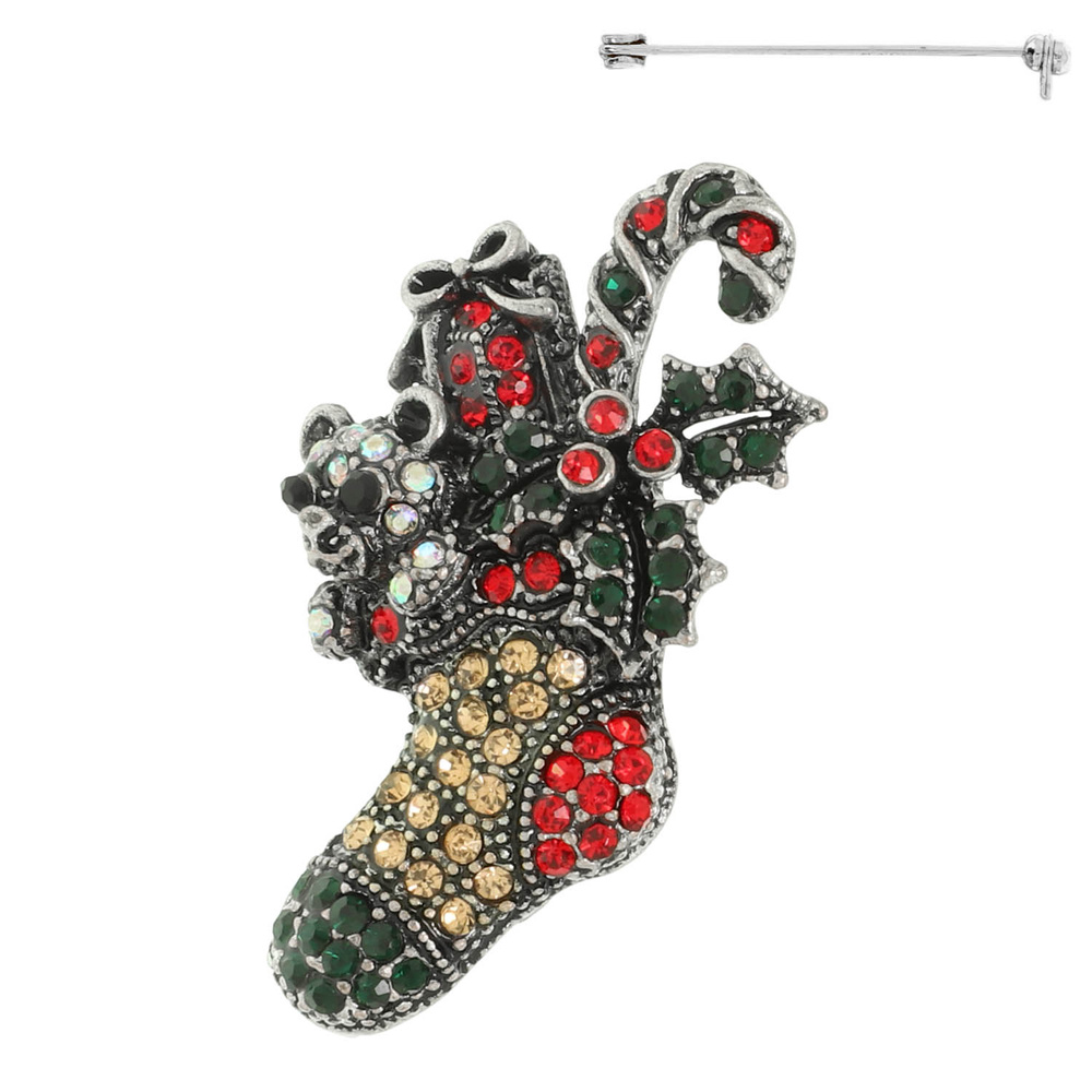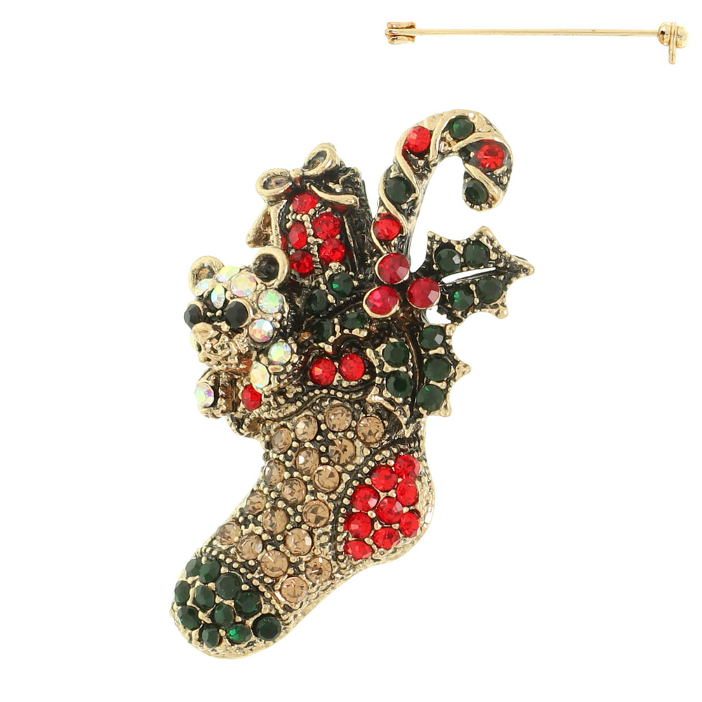 CHRISTMAS STOCKING TEDDY BEAR WITH GIFTS AND CANDY CANE CRYSTAL EMBELLISHED BROOCH PIN