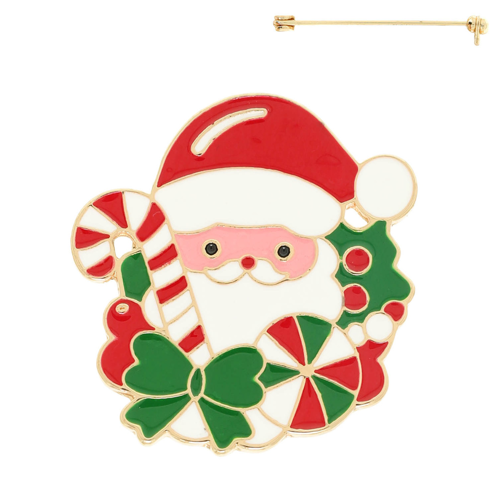SANTA CLAUS ENAMEL BROOCH PIN WITH CANDY CANE WREATH BOW AND PEPPERMINT ACCENTS