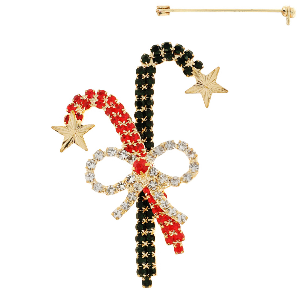 RHINESTONE CHRISTMAS CANDY CANE W/ BOW PIN