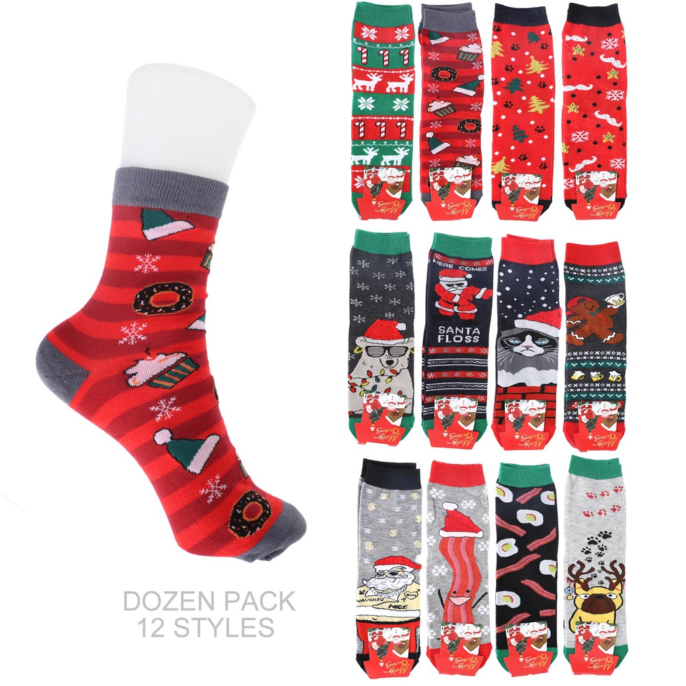 13 PACK 4 STYLES (3-PAIRS EACH STYLE) ADULT SIZE ASSORTED STOCKING STUFFER WINTER CHRISTMAS THEMED COTTON KNIT NOVELTY SOCKS