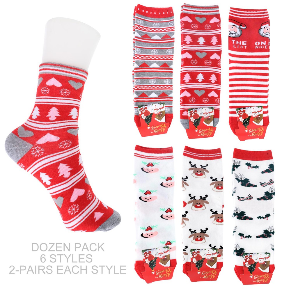 14 PACK 4 STYLES (3-PAIRS EACH STYLE) ADULT SIZE ASSORTED STOCKING STUFFER WINTER CHRISTMAS THEMED COTTON KNIT NOVELTY SOCKS