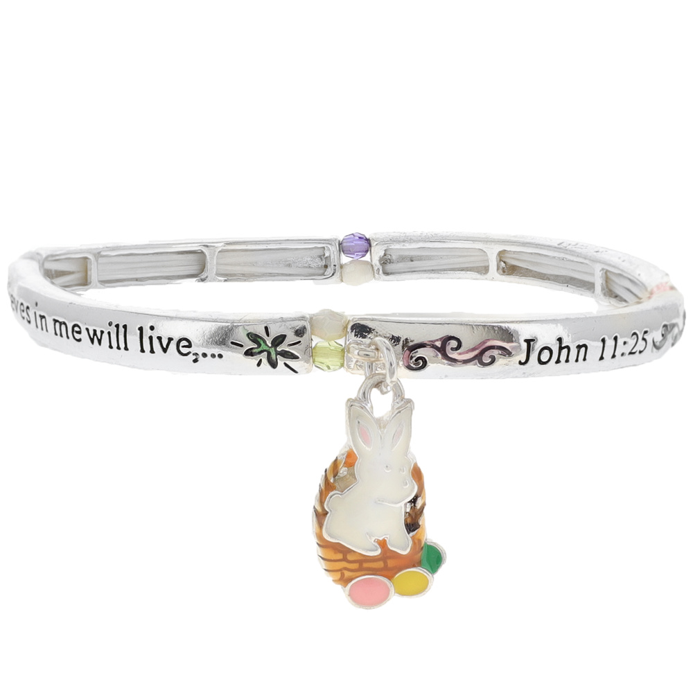 RELIGIOUS BIBLE VERSE EASTER JOHN 11:25 RESURRECTION STRETCH BRACELET WITH BUNNY RABBIT CHARM