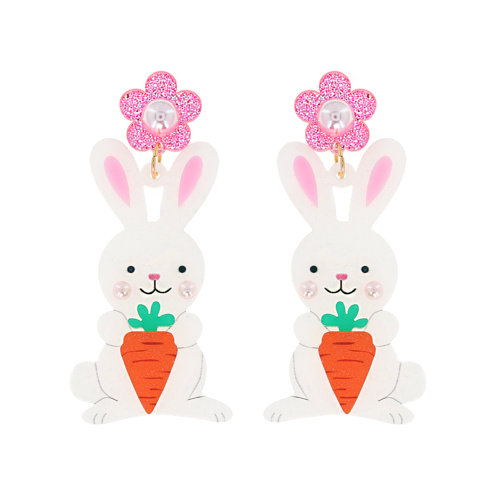 BUNNY & CARROT- 2-TIER FLORAL POST EASTER THEMED DANGLE AND DROP PEARL GLITTER EARRINGS