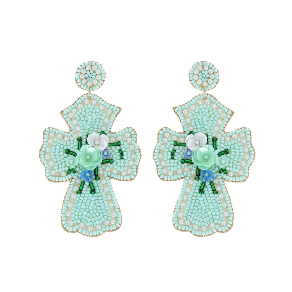 2-tier Easter Sunday Beaded Embroidery Floral Cross Dangle And Drop Earrings