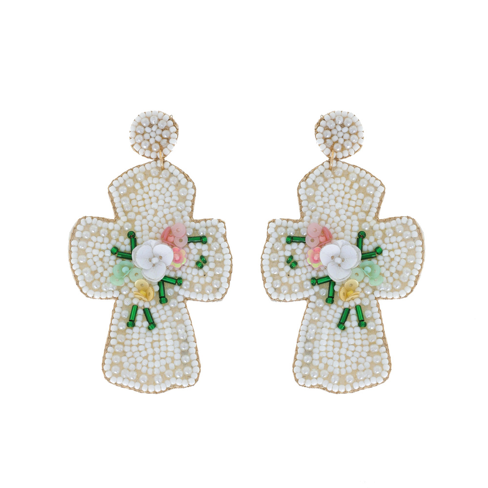 2-tier Easter Sunday Beaded Embroidery Floral Cross Dangle And Drop Earrings