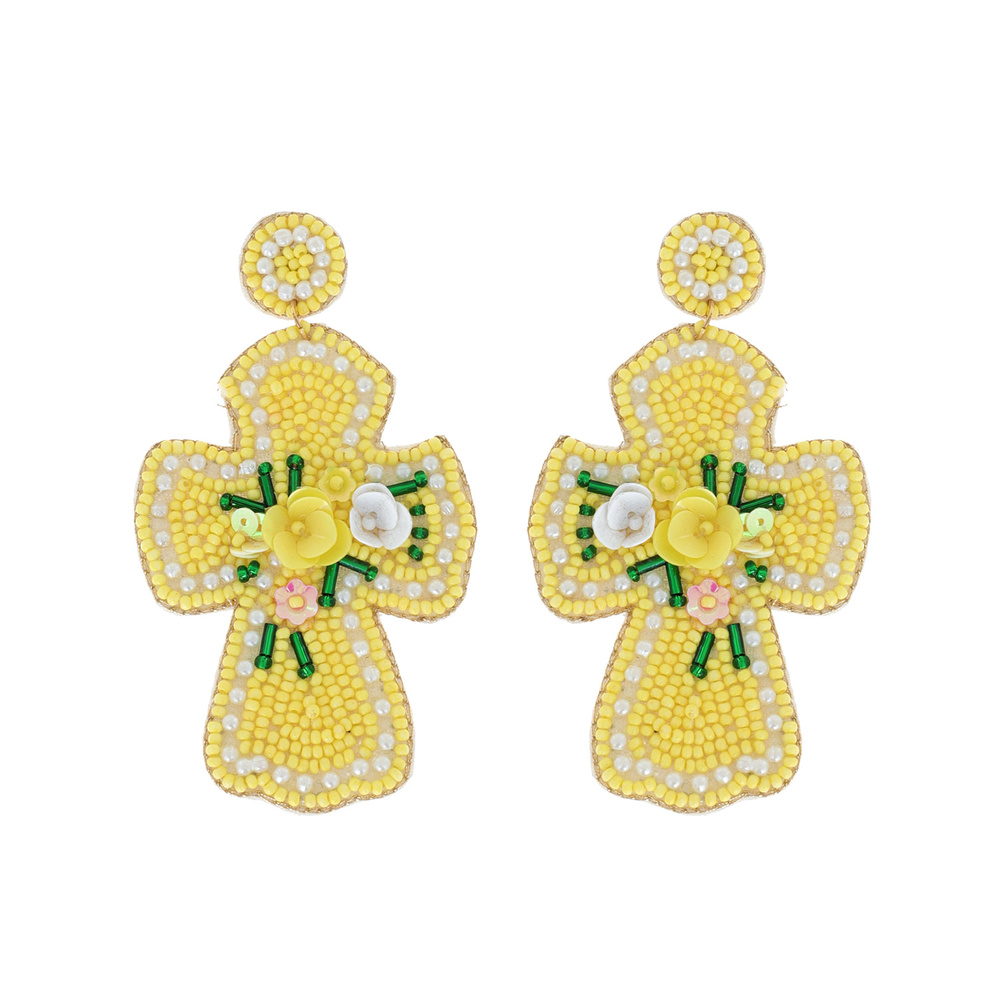 2-tier Easter Sunday Beaded Embroidery Floral Cross Dangle And Drop Earrings