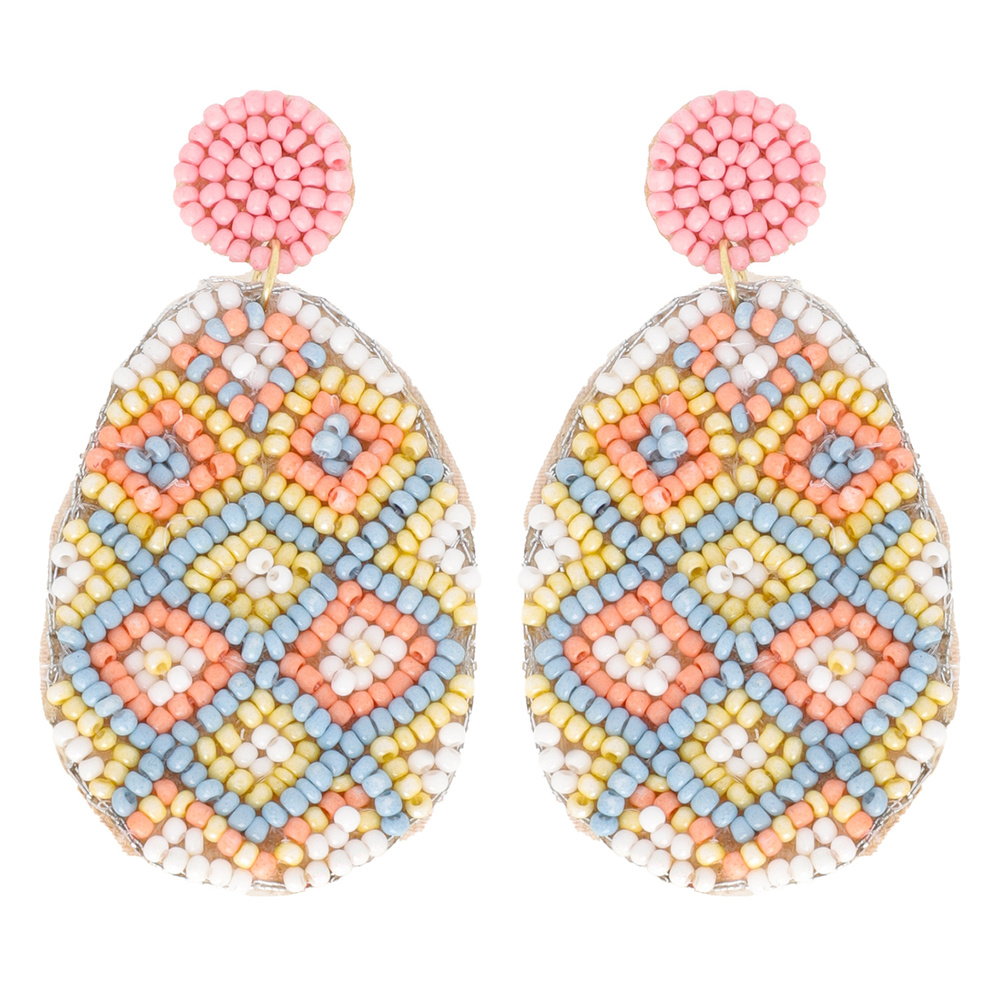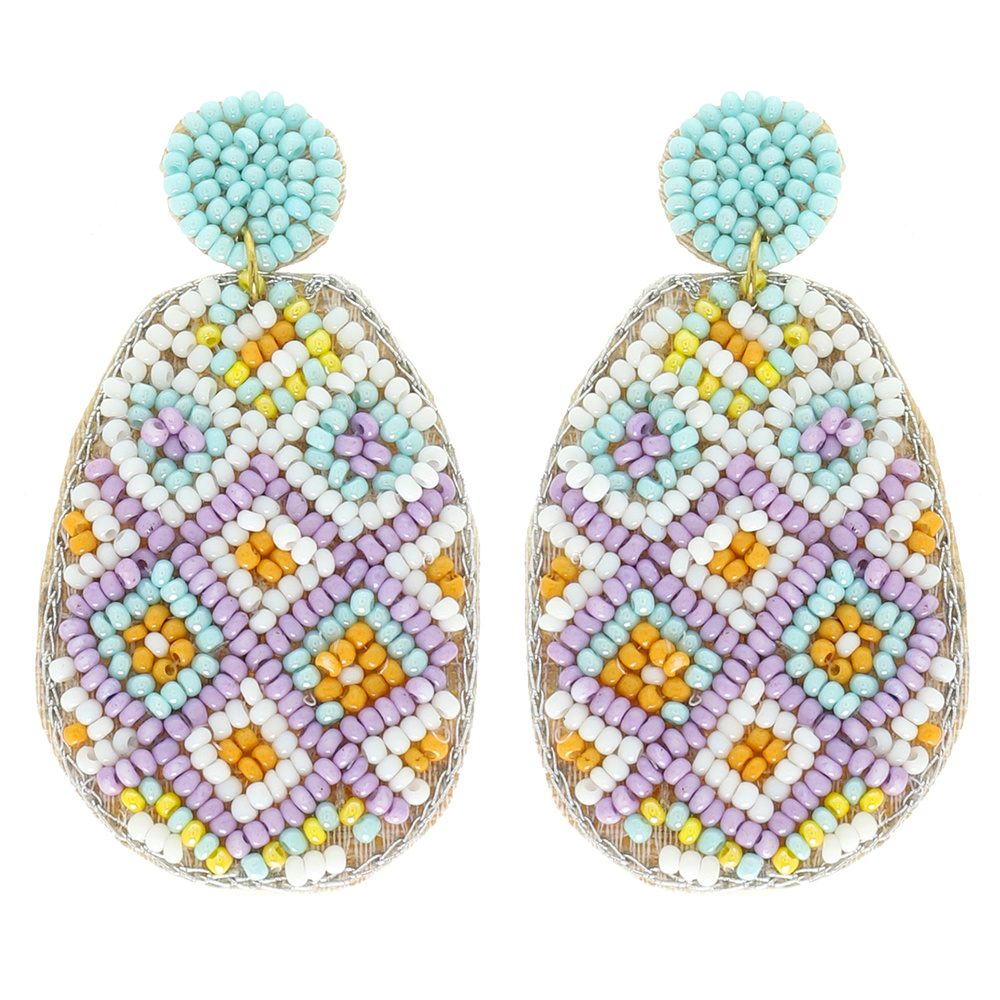 2-TIER SEED BEAD EMBROIDERED EASTER EGG POST DANGLE EARRINGS