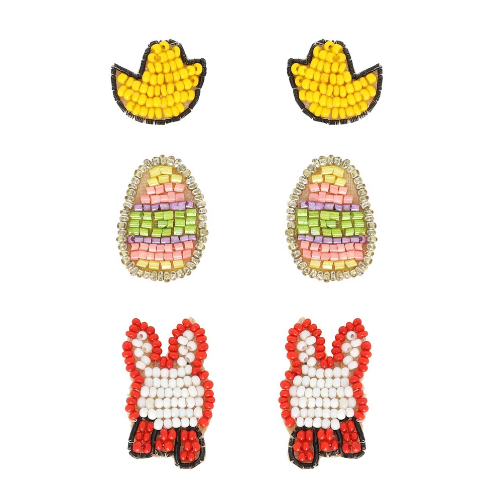 3-PAIR EASTER RABBIT, EASTER EGG PEEP CANDY BEADED EMBROIDERY ASSORTED EARRING SET