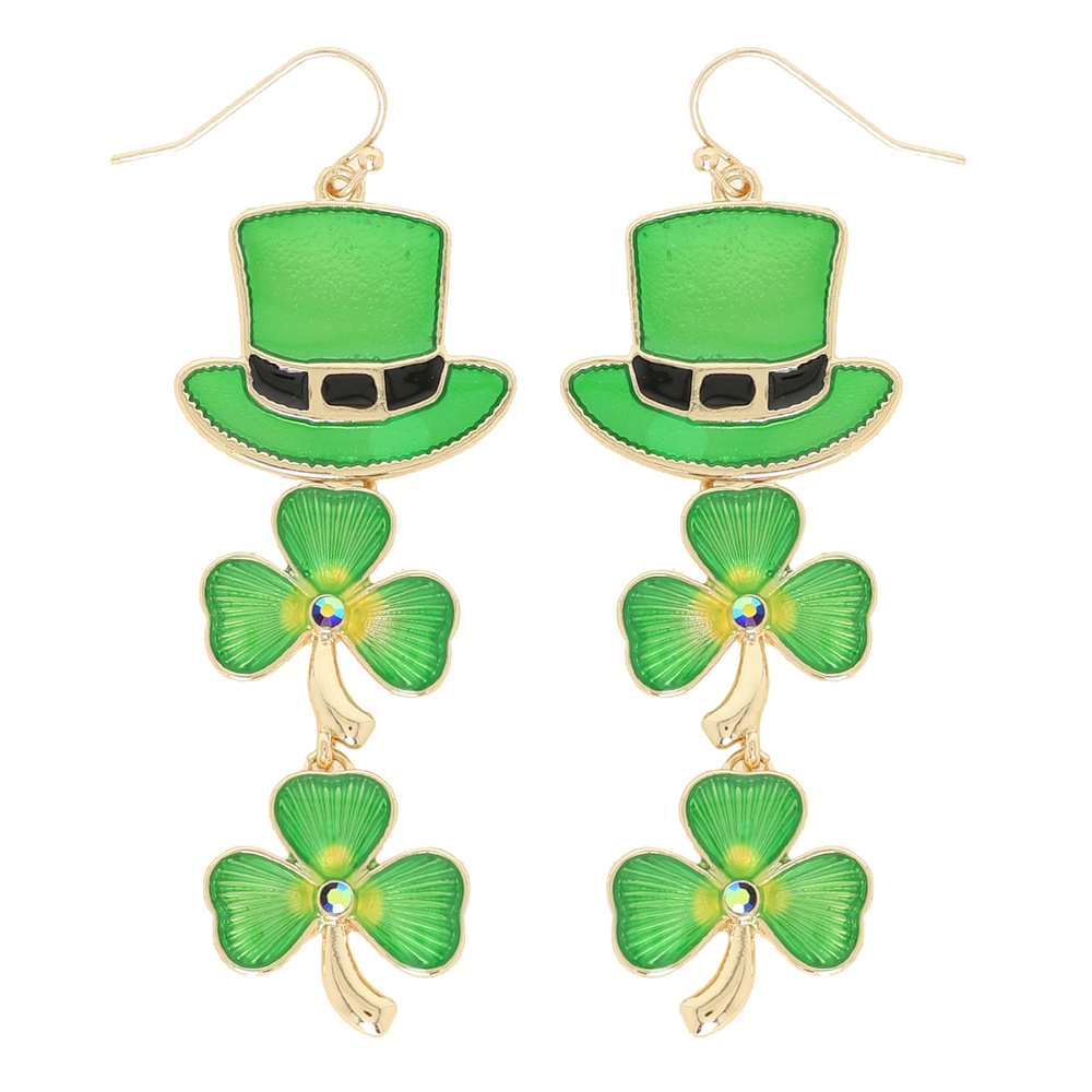 3-TIER SAINT PATRICK'S DAR AB CRYSTAL RHINESTONE LEPRECHAUN HAT AND SHAMROCK ENAMEL COATED METAL DROP EARRINGS IN GOLD TONE METAL