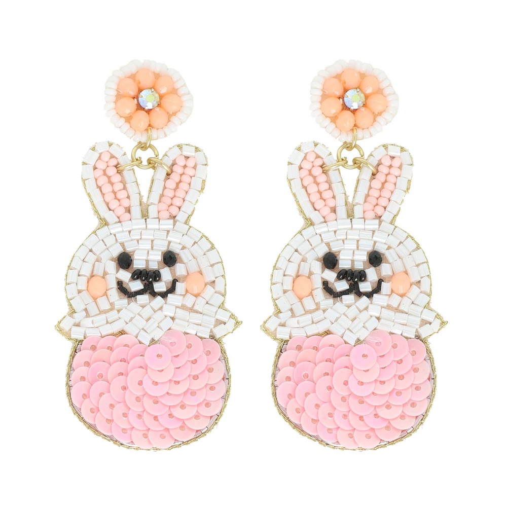 2-TIER EASTER EGG WHITE RABBIT CRYSTAL RHINESTONE BEADED EMBROIDERY LONG DROP EARRINGS