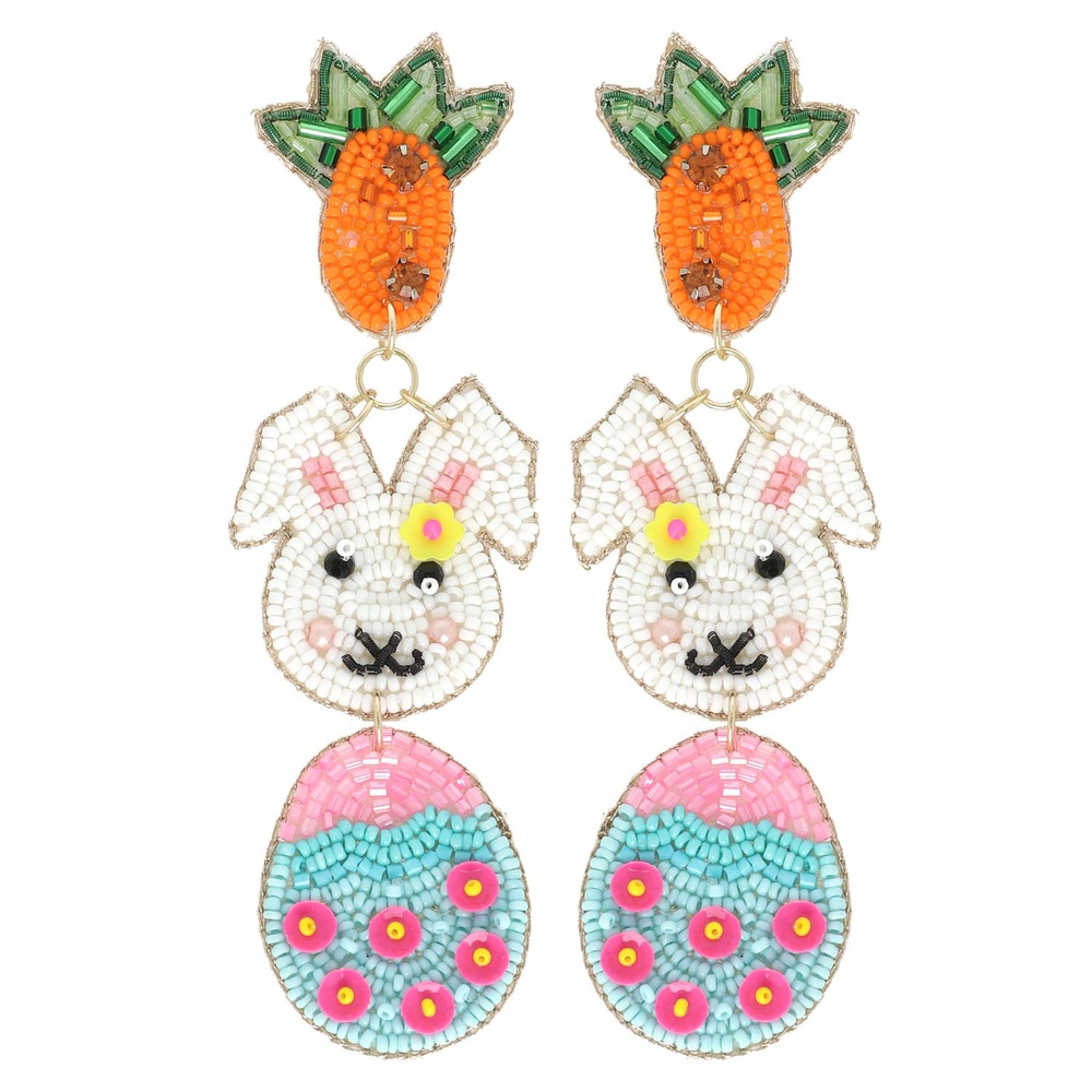 3-TIER RABBIT, CARROT AND EASTER EGG CRYSTAL GEMSTONE BEAD MIX BEADED EMBROIDERY LONG DROP EARRINGS