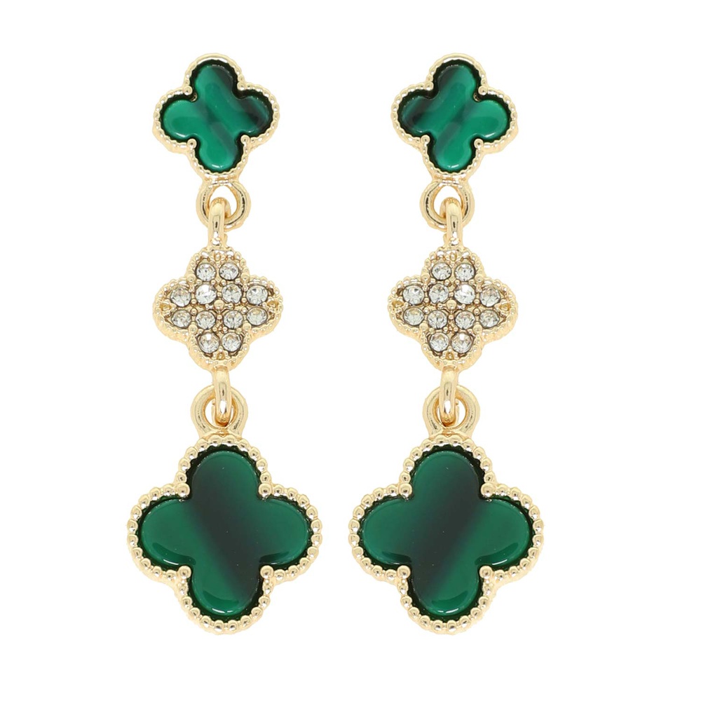 3- TIER FOUR LEAF CLOVER LUCKY QUATREFOIL CRYSTAL RHINESTONE PAVE ENAMEL GEMSTONE LONG DROP EARRINGS