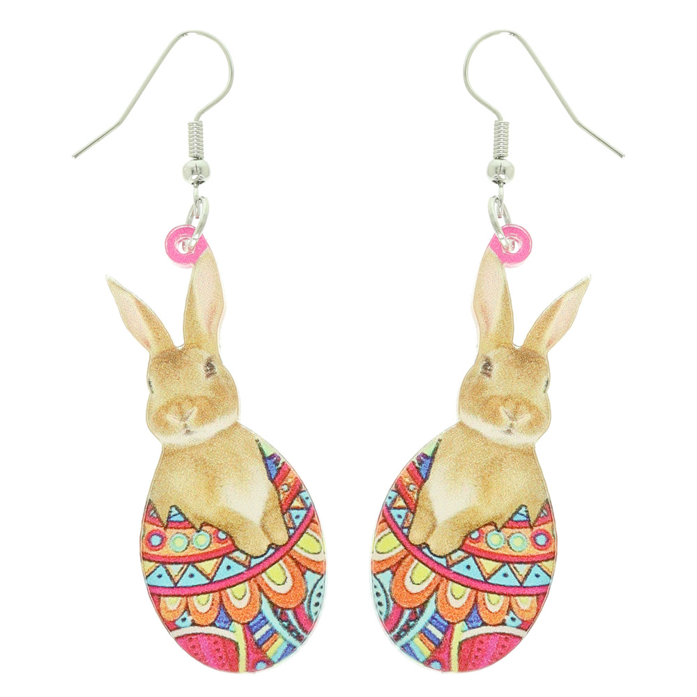 MULTICOLOR EASTER BUNNY IN DECORATIVE EGG GRAPHIC PRINT ACRYLIC DANGLE EARRINGS