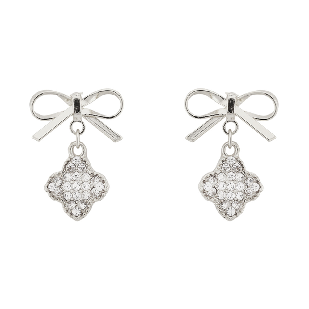 BOW WITH RHINESTONE PAVE CLOVER POST DANGLE EARRINGS IN SILVER-TONE METAL