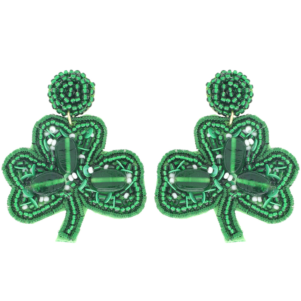 SEED BEADED SAINT PATRICKS DAY SHAMROCK THREE LEAF CLOVER DROP EARRINGS