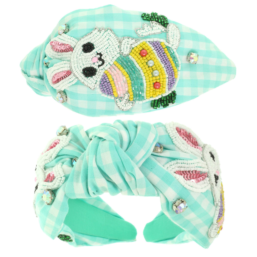 EASTER BUNNY WITH EGG SEED BEADED GINGHAM PATTERNED TOP KNOTTED HEADBAND