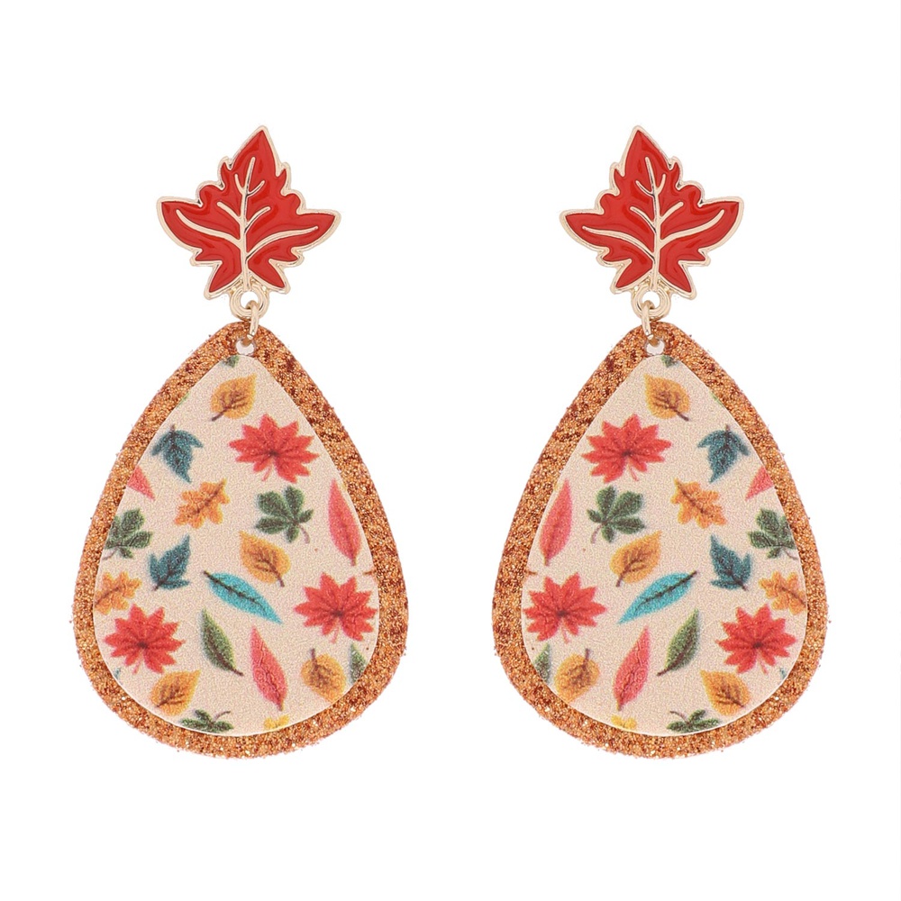 2-TIER ENAMEL COATED POST AUTUMN LEAVES PATTERN GLITTER WOODEN DANGLE AND DROP TEARDROP EARRINGS