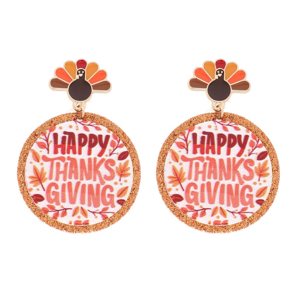 2-TIER ENAMEL COATED HAPPY THANKSGIVING AUTUMN LEAVES GLITTER WOODEN DANGLE AND DROP DISC EARRINGS