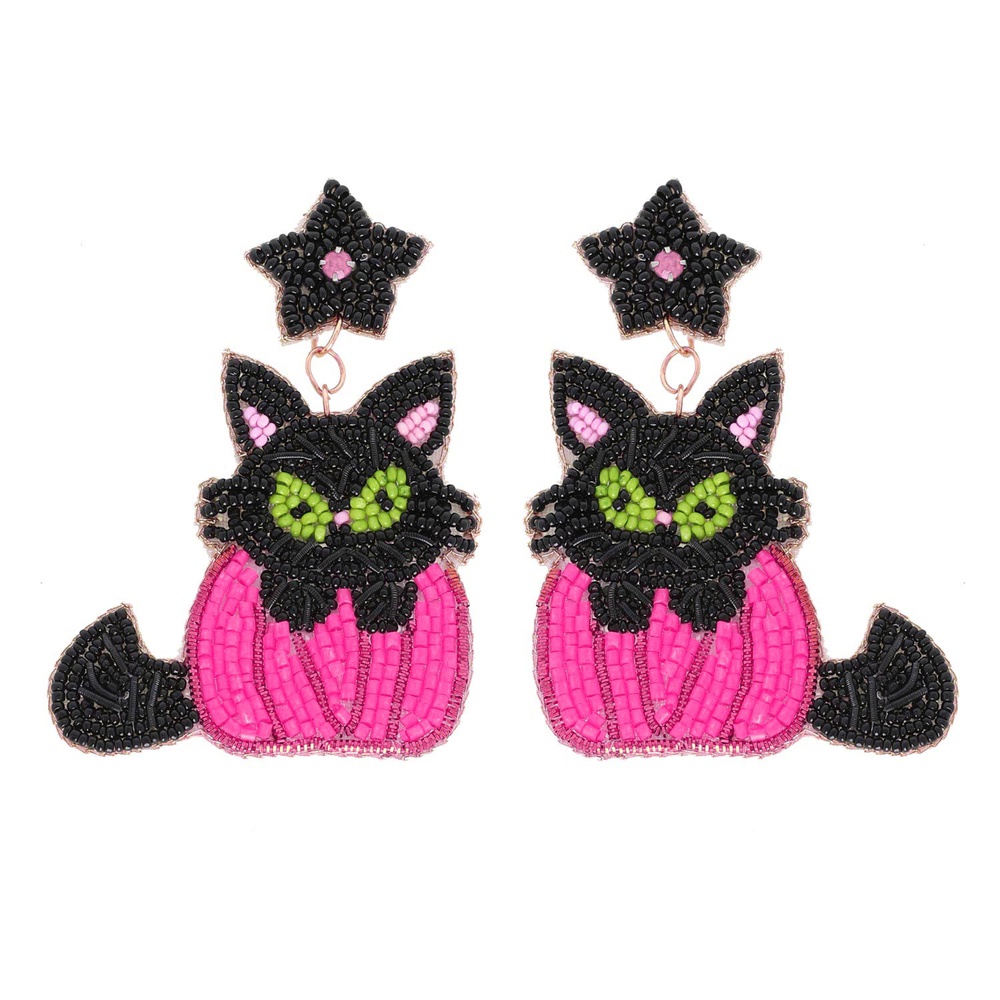 Black Cat In Pumpkin Beaded Halloween Earrings