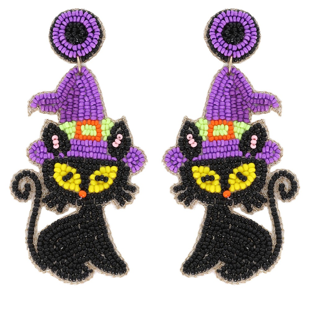 2-TIER WITCH HAT BLACK CAT SEED BEAD HANDMADE BEADED EMBROIDERY HALLOWEEN NOVELTY LONG DROP EARRINGS