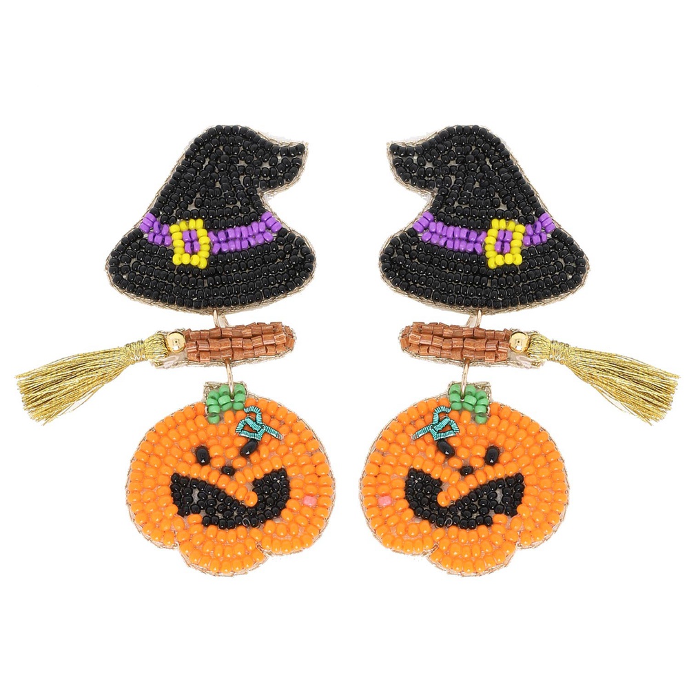 3-TIER WITCH HAT & BROOM JACK O'LANTERN SEED BEAD HANDMADE BEADED EMBROIDERY HALLOWEEN NOVELTY DANGLE AND DROP EARRINGS