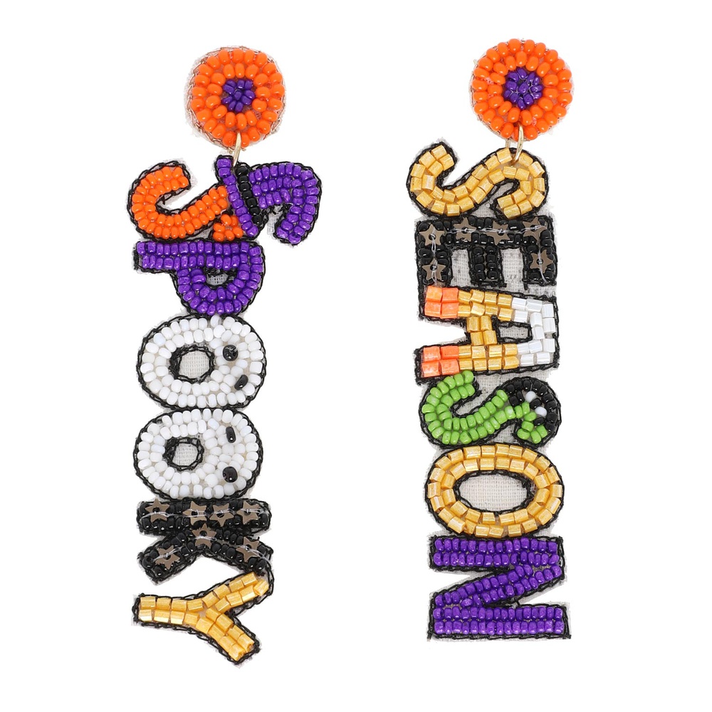 2-TIER "SPOOKY SEASON" HALLOWEEN CHARACTERS SEED BEAD HANDMADE BEADED EMBROIDERY NOVELTY LONG DROP EARRINGS