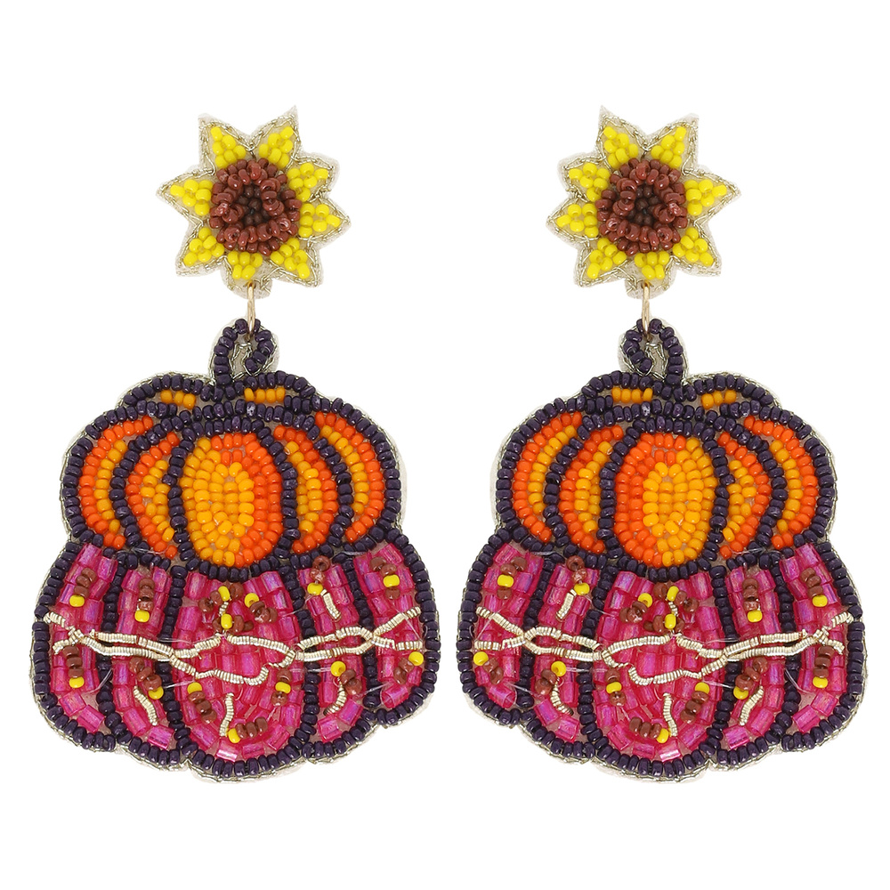 2-TIER SUNFLOWER POST THANKSGIVING PUMPKIN BEADED EMBROIDERY DANGLE AND DROP EARRINGS