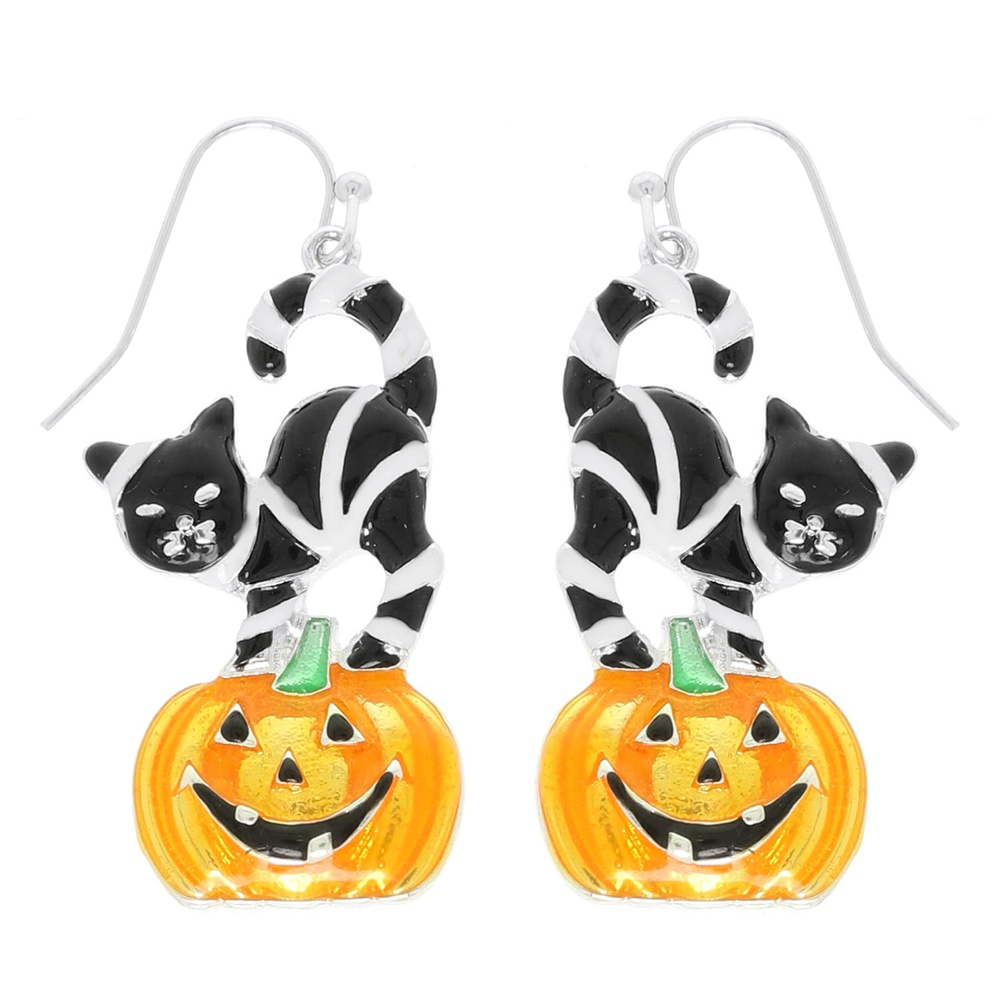 HALLOWEEN PLAYFUL BLACK CAT ON PUMPKIN ENAMEL EARRINGS