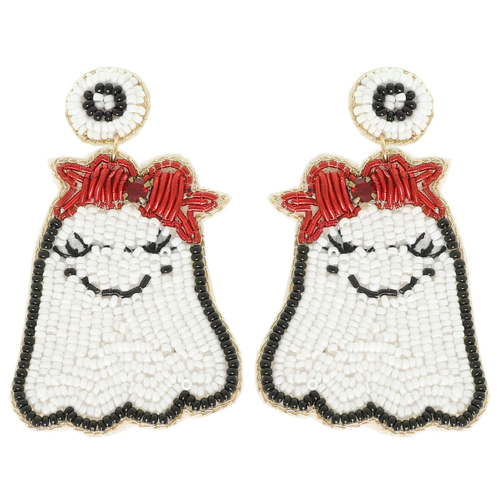 HALLOWEEN GHOST WITH RED BOW CRYSTAL SEED BEADED POST DANGLE EARRINGS