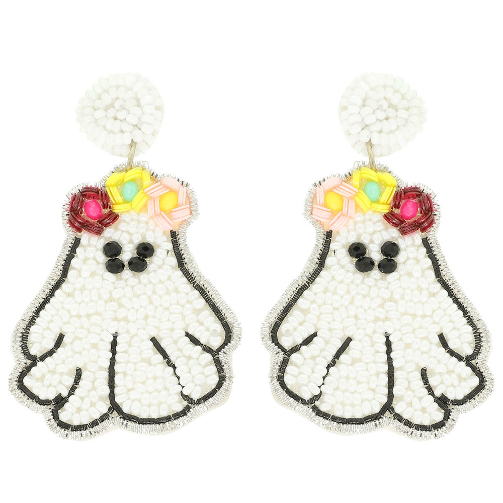 HALLOWEEN FLORAL GHOST WITH FLOWER CROWN SEED BEADED POST DANGLE EARRINGS