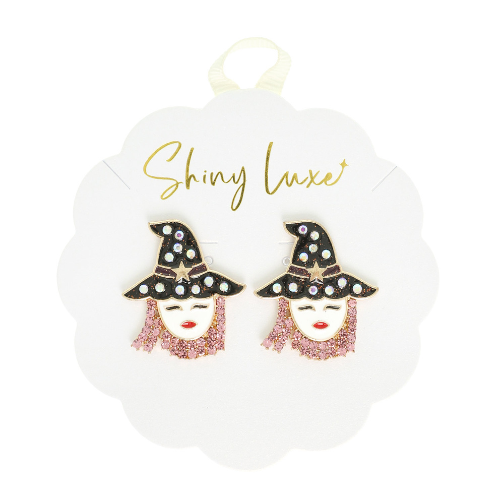 HALLOWEEN THEME WITCH FACE ENAMEL POST EARRINGS WITH BLACK HAT GLITTER HAIR AND CRYSTAL ACCENTS