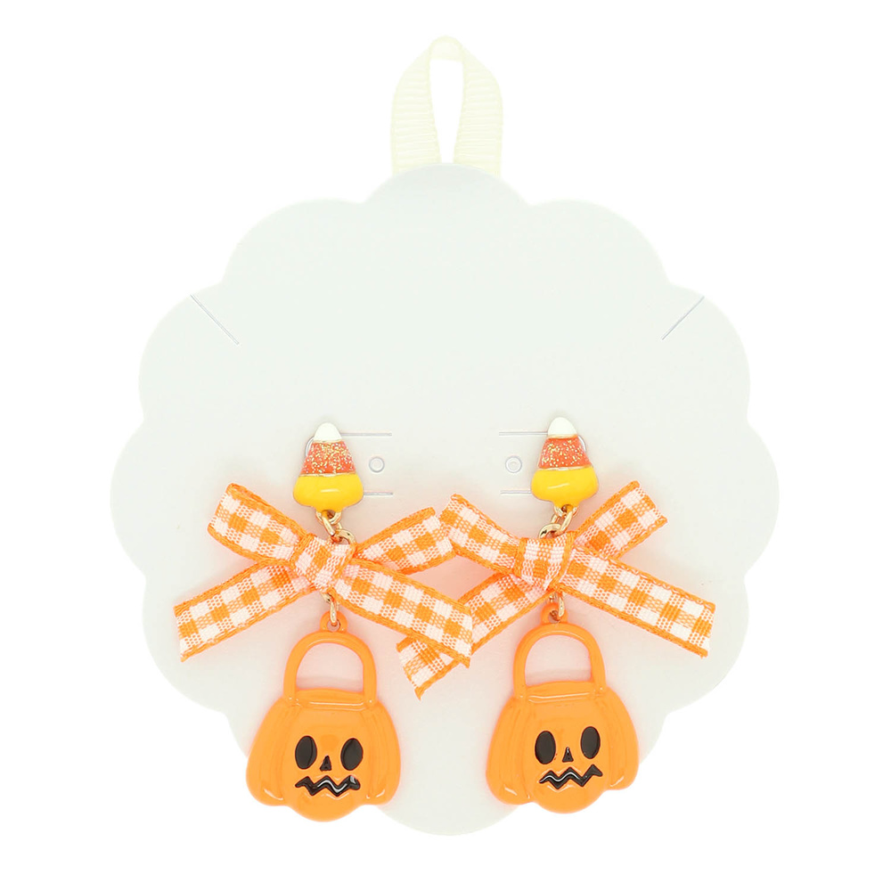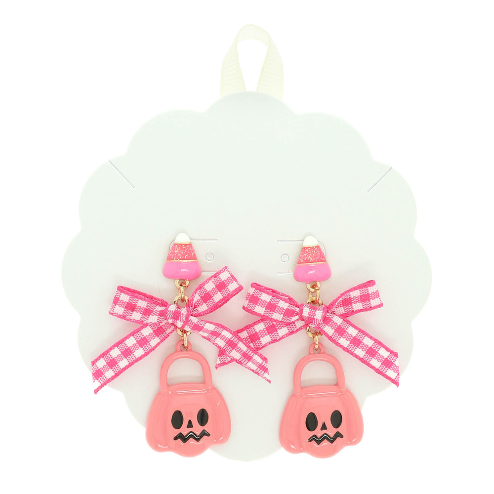 PUMPKIN BUCKET ENAMEL POST EARRINGS WITH CHECKERED BOW AND CANDY CORN