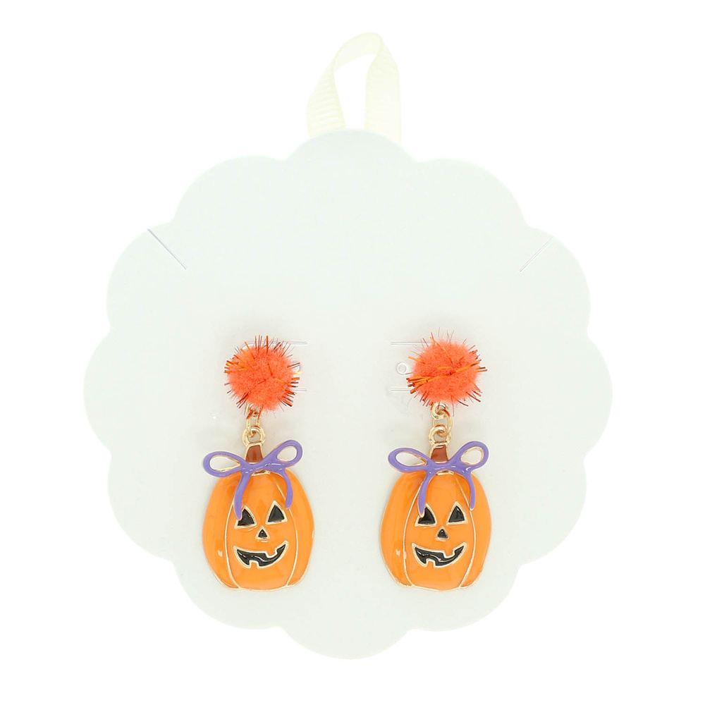 JACK O LANTERN ENAMEL POST EARRINGS WITH PURPLE BOWS ORANGE POM POM STUDS