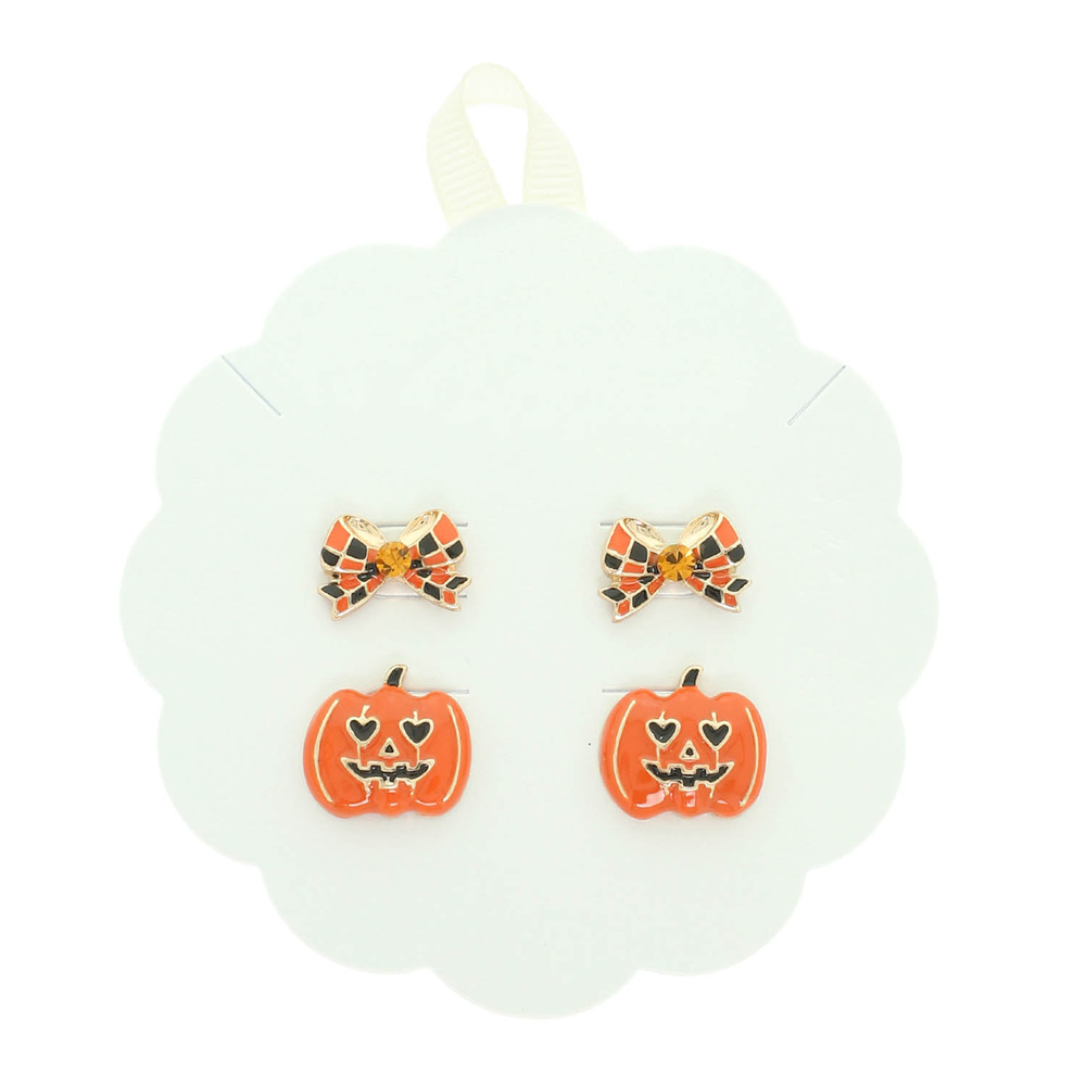 TWO PAIR ENAMEL STUD EARRING SET WITH JACK O' LANTERN PUMPKIN AND BOW FEATURING CRYSTALS