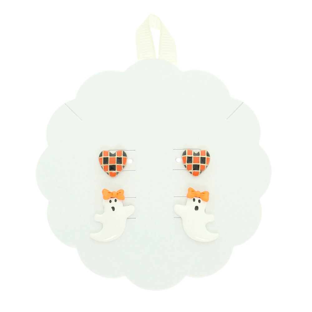 TWO PAIR ENAMEL STUD EARRING SET WITH CHECKERED HEART AND BOW GHOST
