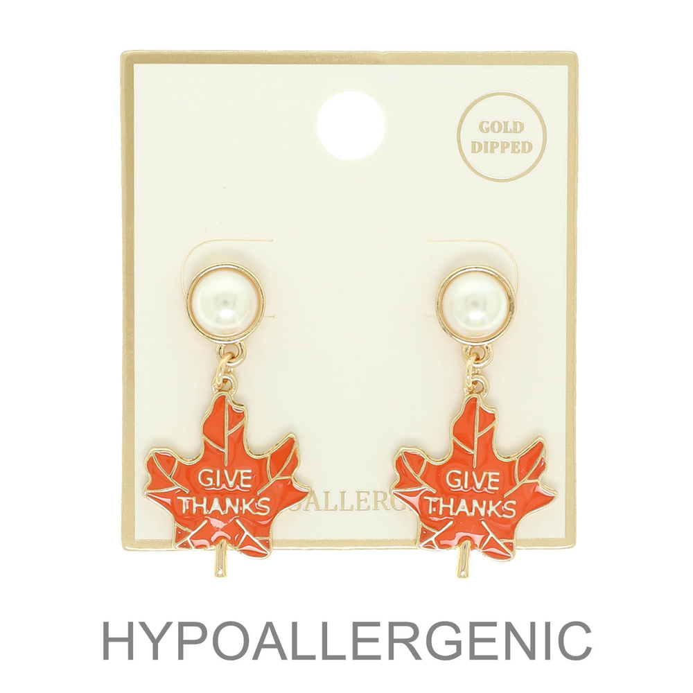 GOLD DIPPED ENAMEL GIVE THANKS MAPLE LEAF DROP EARRINGS WITH PEARL STUD TOP