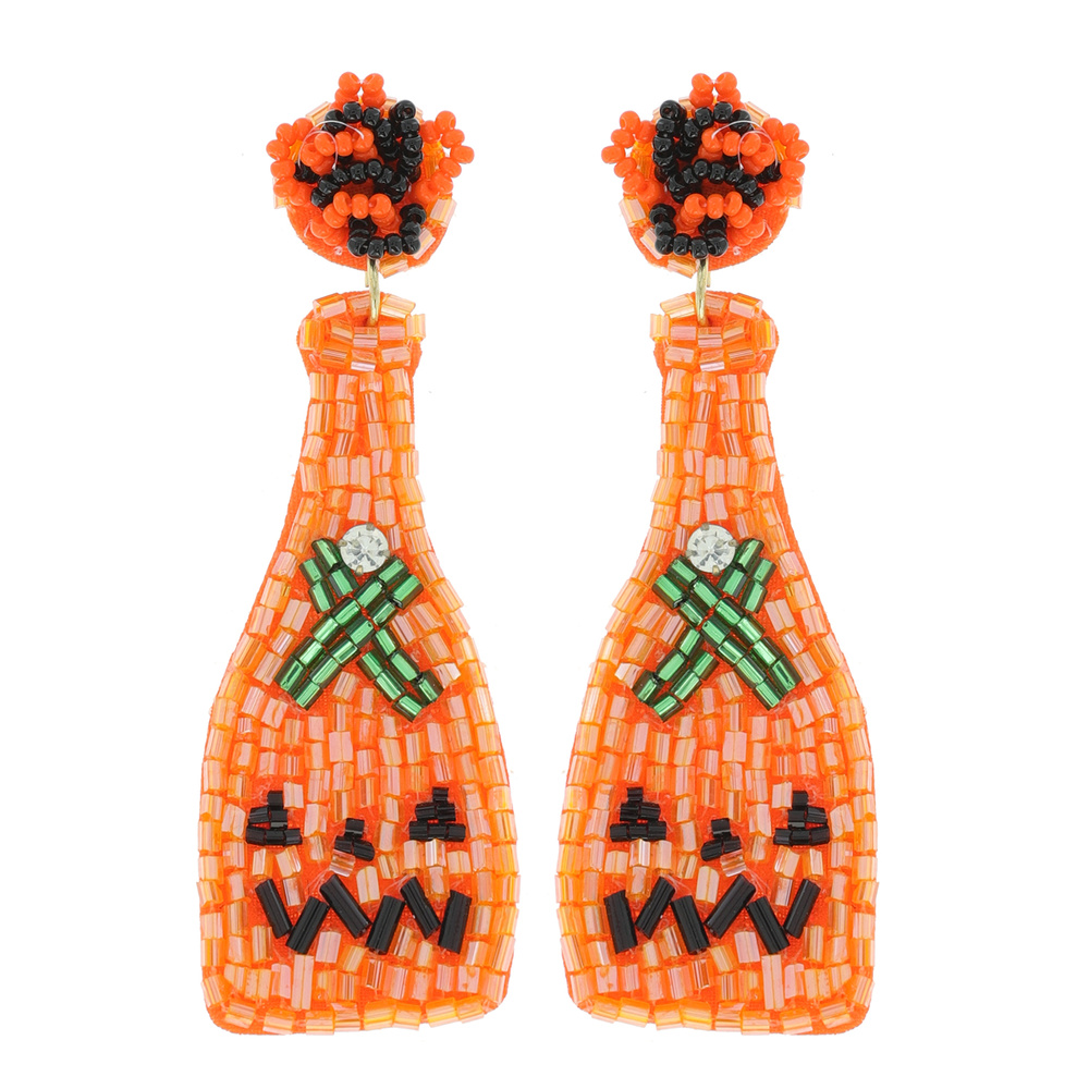 Halloween Pumpkin Jack O Lantern Wine Champagne Bottle Seed Bead Handmade Beaded Dangle And Drop Earrings