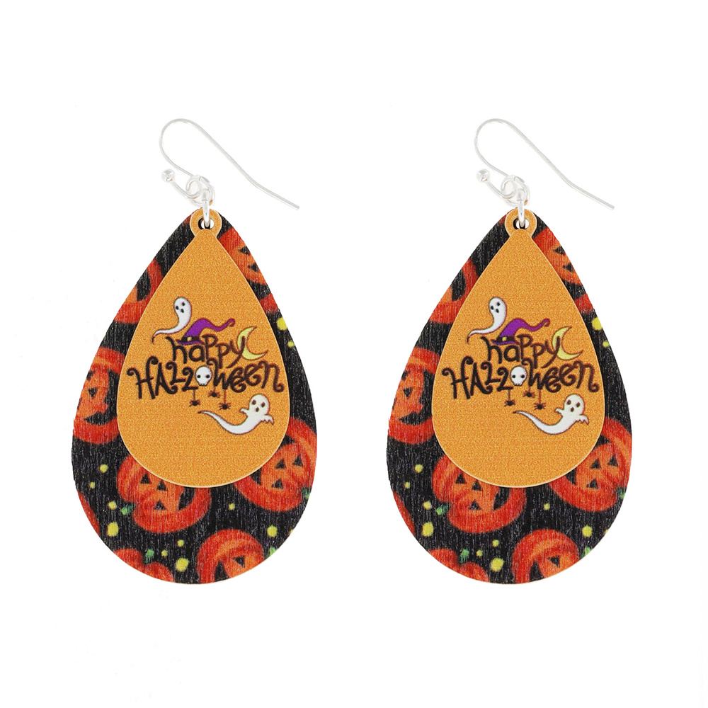 GHOST "HAPPY HALLOWEEN" - PRINTED DOUBLE LAYER WOODEN TEARDROP HALLOWEEN THEMED DANGLE AND DROP HOOK EARRINGS