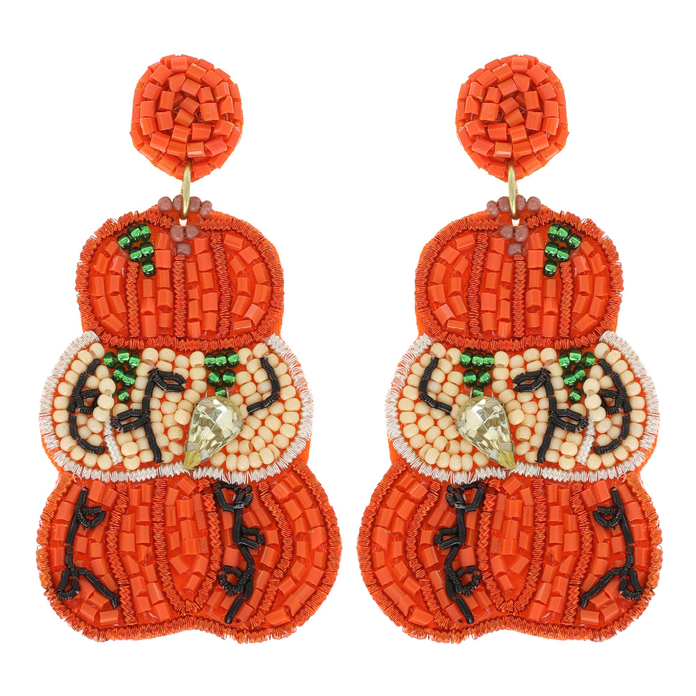 Pumpkin Patch Autumn Harvest Seed Bead Handmade Beaded Embroidery Crystal Rhinestone Jeweled Drop Novelty Earrings