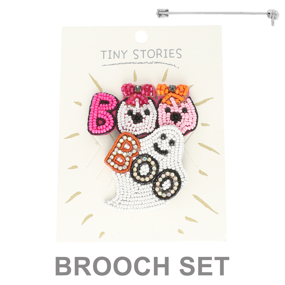 2 PACK "BOO" GHOST BEAD RHINESTONE EMBELLISHED BROOCH PIN SET