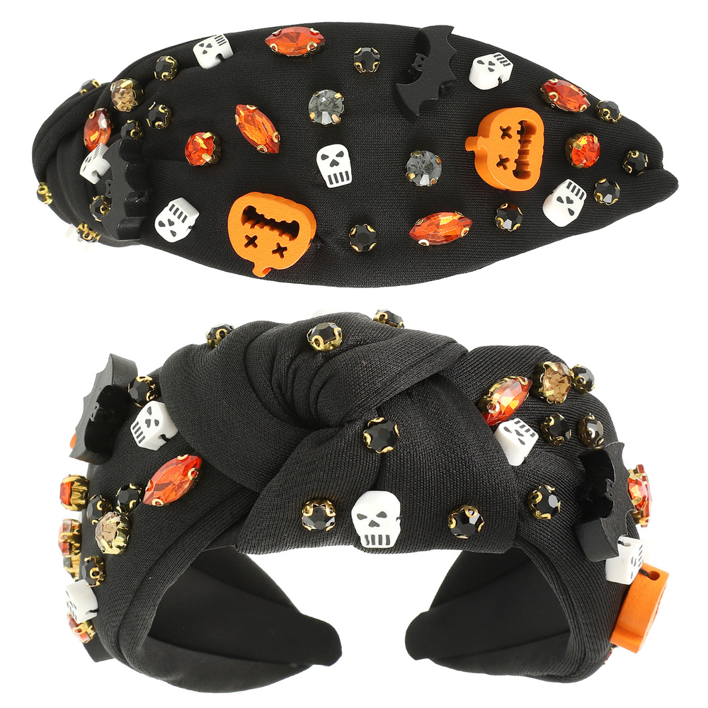 HALLOWEEN SKULL BAT AND PUMPKIN CHARM CRYSTAL EMBELLISHED TOP KNOTTED HEADBAND