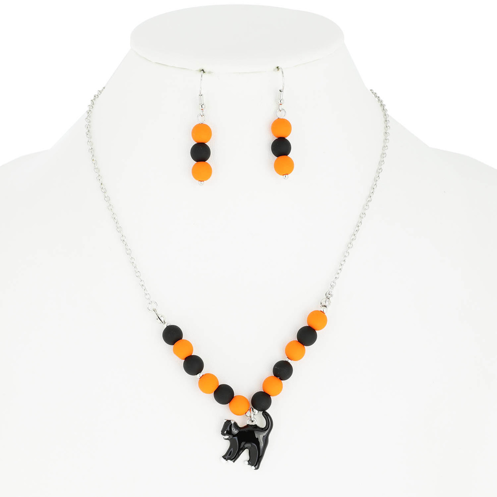 Halloween Black Cat Pendant Rubber Ball Necklace And Earrings Set