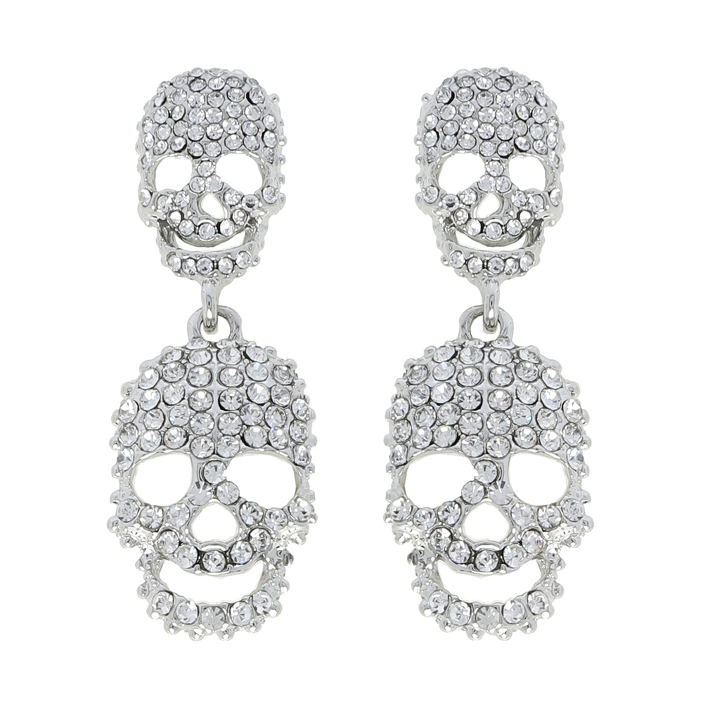 2-TIER CRYSTAL RHINESTONE PAVE DOUBLE SKULL LONG DROP EARRINGS
